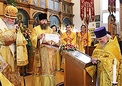 The festal services were exceptional due to the presence of the ruling hierarchs of the diocese and deanery, His Eminence Archbishop Kyrill of San Francisco and Western America and His Grace Bishop Theodosy of Seattle, accompanied by the Cathedral Dean, Archpriest Alexei Kotar and his assistant Priest Paul Volkoff, along with four other priests, Hieromonk Paul (Kilman), Priests Stefan Dragoi, Steven Clark, and Theodore Obrastoff, and five deacons: Archdeacon Peter (Karakozoff), Protodeacon Paul Bilibin, and Deacons Arsenios Blain, Ruslan Kroshko and Allen MacDougall. The presence of the monks from the All-Merciful Savior Monastery of Vashon Island also graced the festivities. The cathedral choir under the direction of Gregory Kotar contributed to the grandeur of the services with the excellent execution of the choral compositions creating an atmosphere of prayerfulness and beauty. The extraordinaire floral decorations in the cathedral were the masterwork of Olga Meleshko. The presence of Protodeacon Paul and Tatiana Bilibin (former Head Sister), who had moved away to Arizona brought joy to the congregation. The services were well attended despite it being a workday and the unusually cold weather which created icy hazardous driving conditions. Two chalices were needed to Commune the approximately one hundred communicants. Undiscouraged by the freezing temperatures, the liturgy was concluded by a procession around the church and the presentation of a Synodal Gramota to the dean and the parish commemorating this historic date.