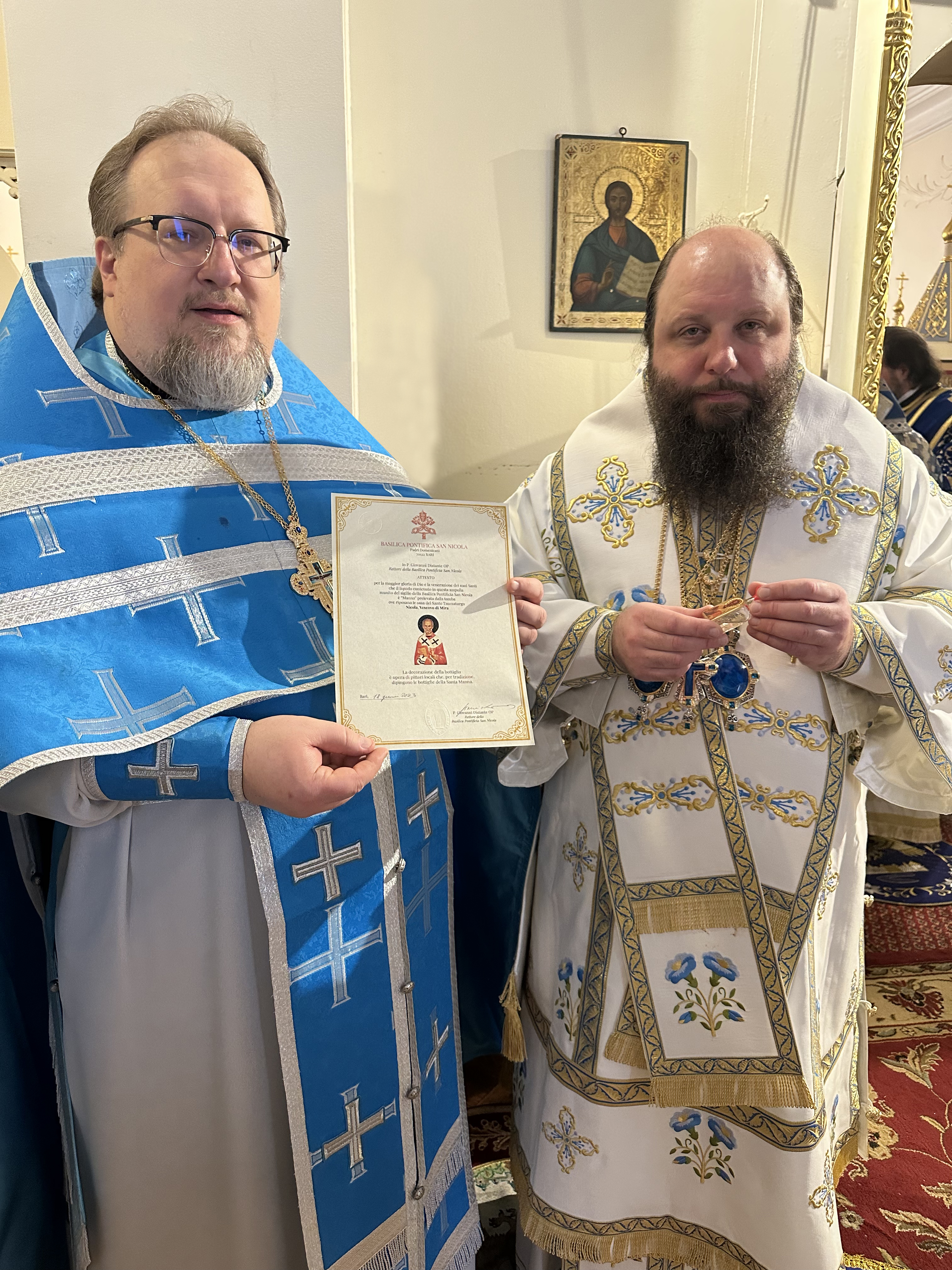 Abbot Arseny (Manko) brought a special gift from the Papal Basilica of St Nicholas in the city of Bari, Italy, and its Rector, Reverendissimo Padre Giovanni Distante, Rettore della Pontificia Basilica di San Nicola: holy myrrh (la manna di S. Nicola) from the relics of St Nicholas the Miracle-worker, along with an official certificate of authenticity. Noteworthy is that a similar holy gift was presented to Metropolitan Philaret (Voznesensky), one of Metropolitan Nicholas’ predecessors as Primate of the Russian Orthodox Church Outside of Russia. His Eminence received the gift with special piety, expressing his heartfelt gratitude and instructions to return the favor with a gift.