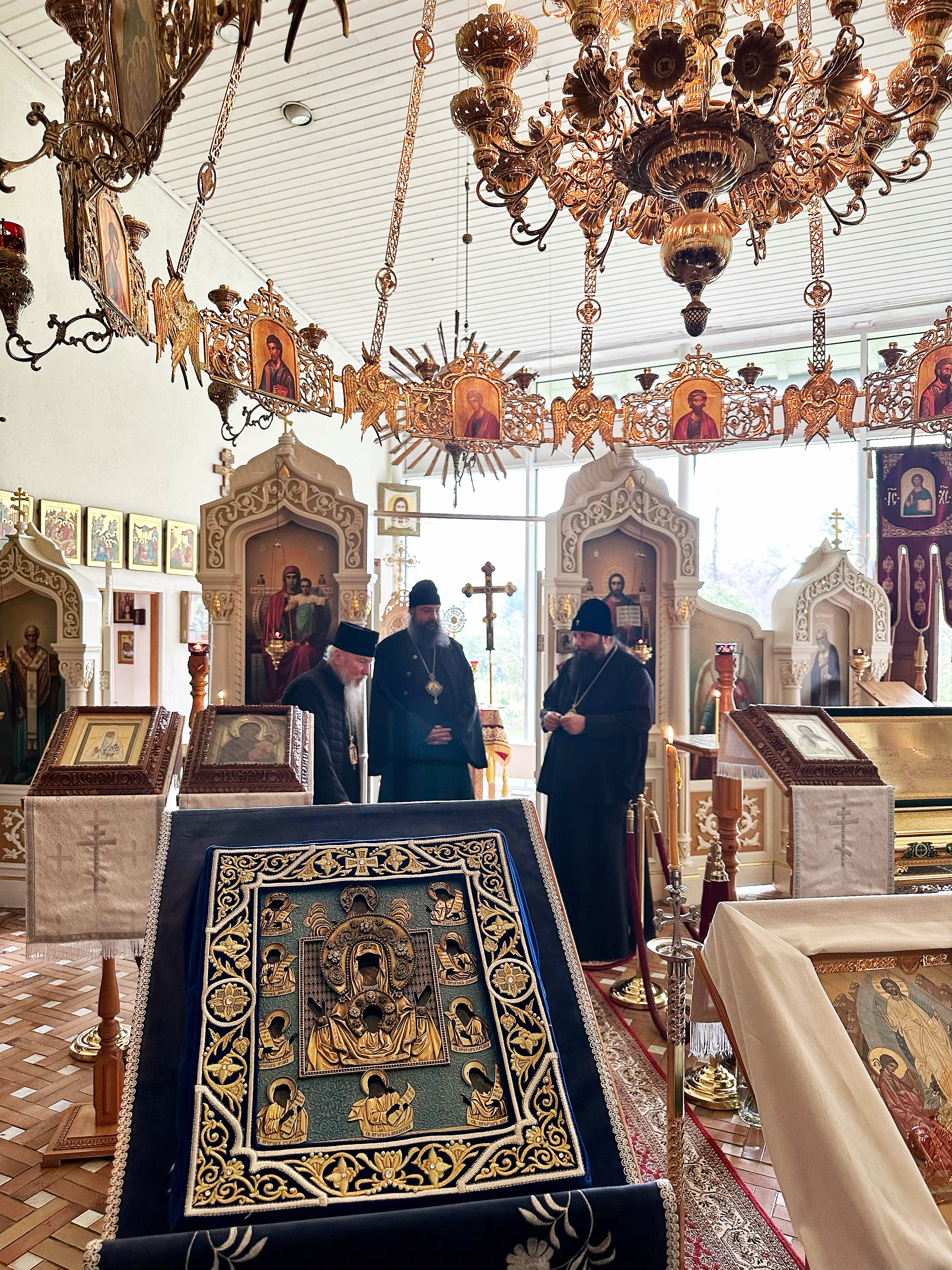 On Wednesday, 3 May, 2023, His Eminence Metropolitan Nicholas of Eastern America and New York, First Hierarch of the Russian Orthodox Church Outside of Russia, accompanying the Kursk-Root Icon of the Mother of God “of the Sign,” arrived in Munich, Germany. His Eminence Metropolitan Mark of Berlin and Germany and His Grace Bishop Job of Stuttgart met the delegation at the airport, whence they departed for St Job of Pochaev Monastery. The monastic brethren warmly greeted the great holy relic and the Primate of the Russian Church Abroad.