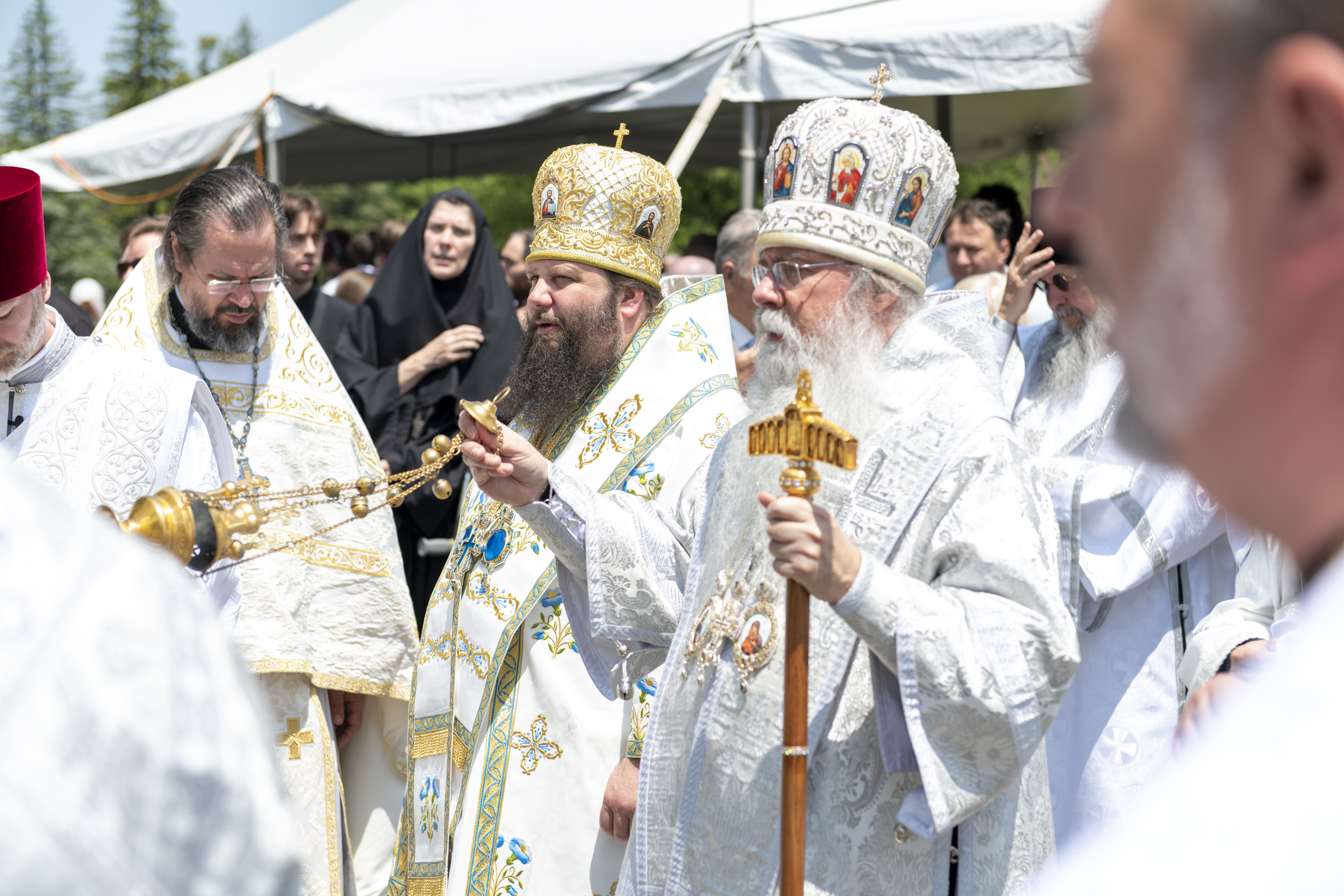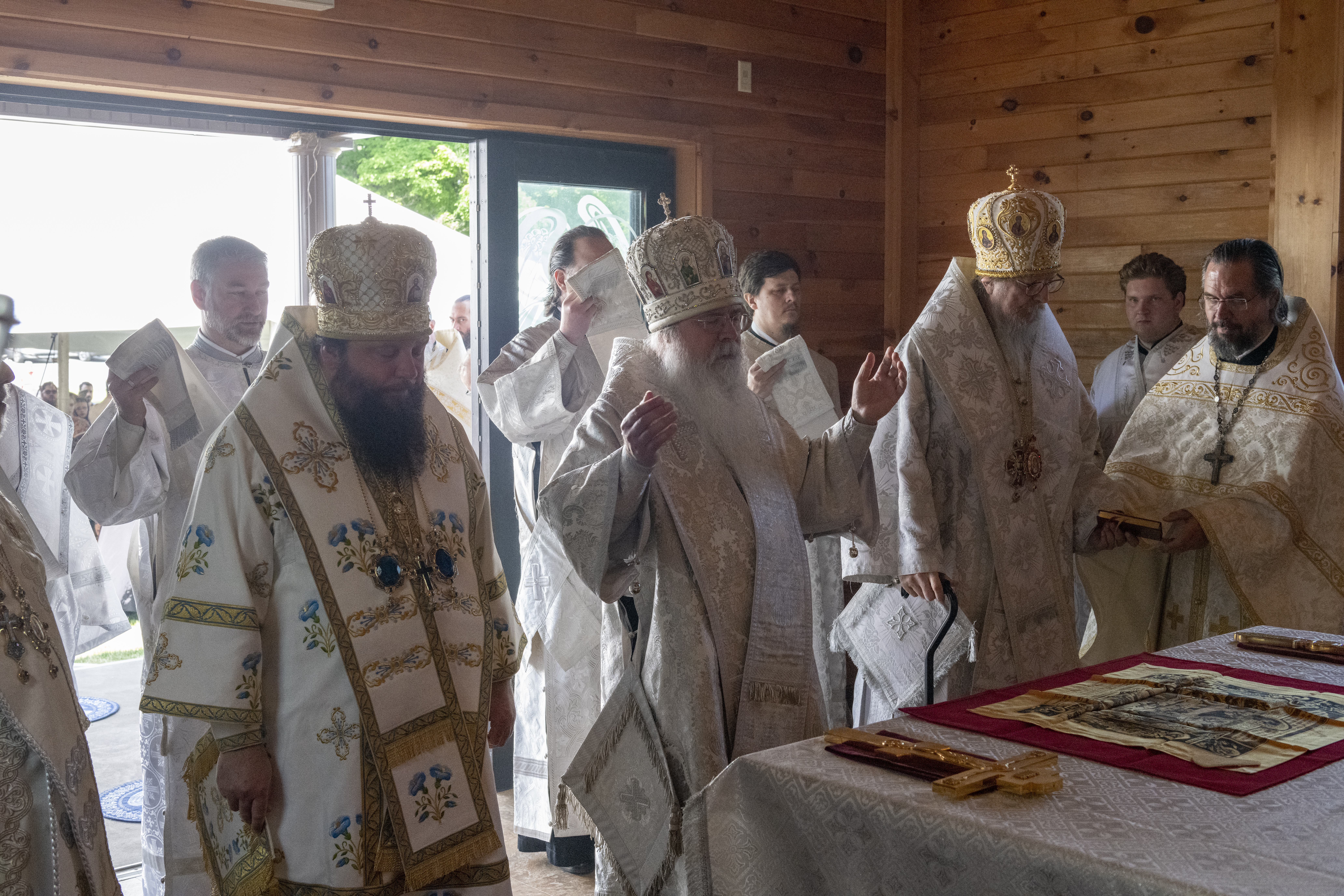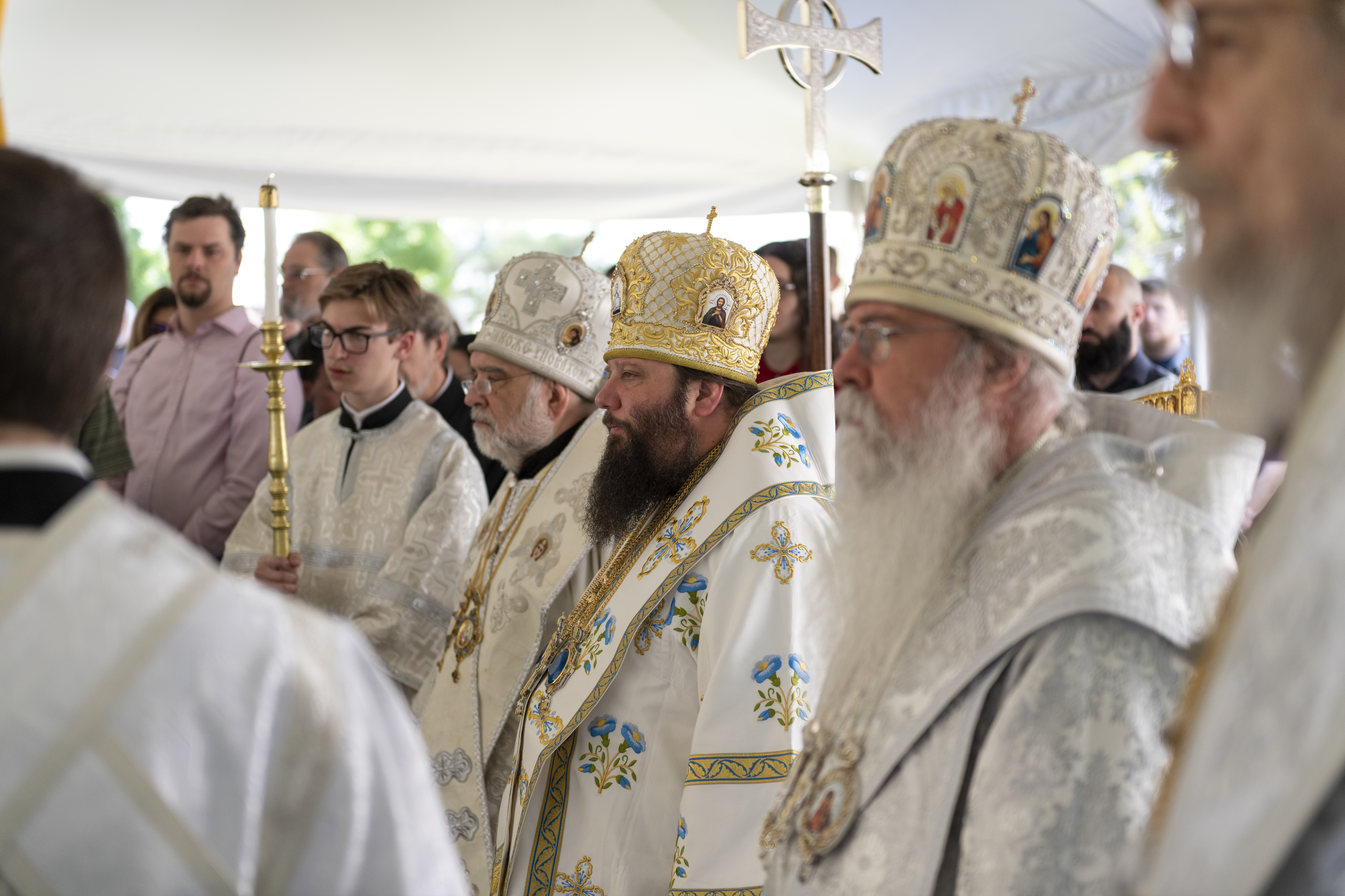 On 29 May, 2023, the Monday of the seventh week after Pascha, coinciding with the observance of Memorial Day, His Eminence Metropolitan Nicholas of Eastern America and New York, First Hierarch of the Russian Orthodox Church Outside of Russia, visited St Tikhon Stavropighial Monastery of the Orthodox Church in America in Pennsylvania. Here His Eminence and his delegation participated in the traditional pilgrimage and celebration of Divine Liturgy, headed by His Beatitude Metropolitan Tikhon, Primate of the OCA. In addition to the ROCOR delegation, joining the hierarchs in the service were His Eminence Archbishop Melchizedek of Pittsburgh and Western Pennsylvania; His Eminence Archbishop Michael of New York and New Jersey; Archimandrite Sergius, Prior of St Tikhon’s Monastery; Archpriest Alexander Rentel, Chancellor of the OCA; Archpriest John Parker, Dean of St Tikhon’s Seminary, along with other clerics of the monastery and seminary and visiting clergymen.