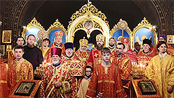 Following the piously-sung vigil of the Feast on Saturday evening, at which Vladyka Alexander was met at the entrance, Divine Liturgy combined the Sunday celebration of the Resurrection with the sacred memory of the Parish’s heavenly patroness. Vladyka Irenei was met by the warden of the parish, Michael Aymon, and was joined by Vladyka Alexander on the cathedra for the liturgical service.