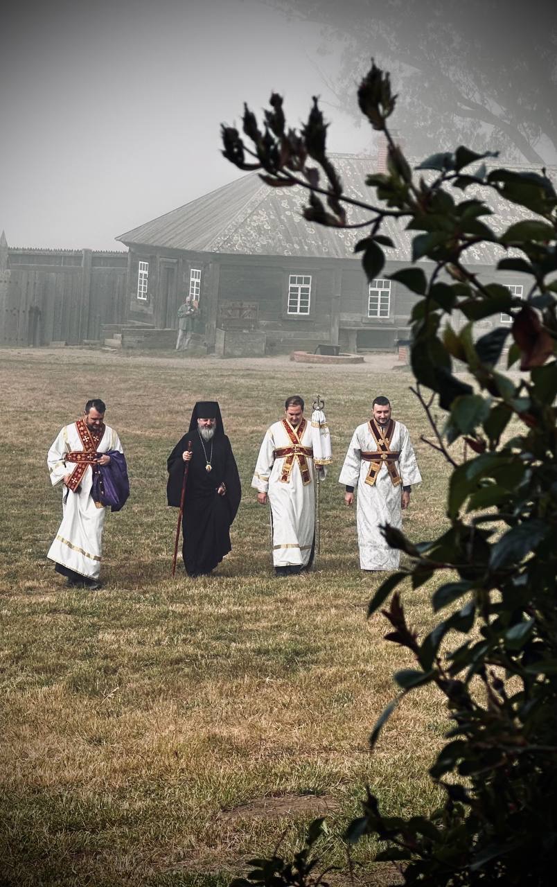 At the end of Divine Liturgy, a multitude of pilgrims and clergy marched in procession to the burial place of the Russian colonists, where a memorial litiya was performed. After the service, the pilgrims went to the Church of the Kazan Icon of the Mother of God on the Russian River, where a festive luncheon was offered to everyone.