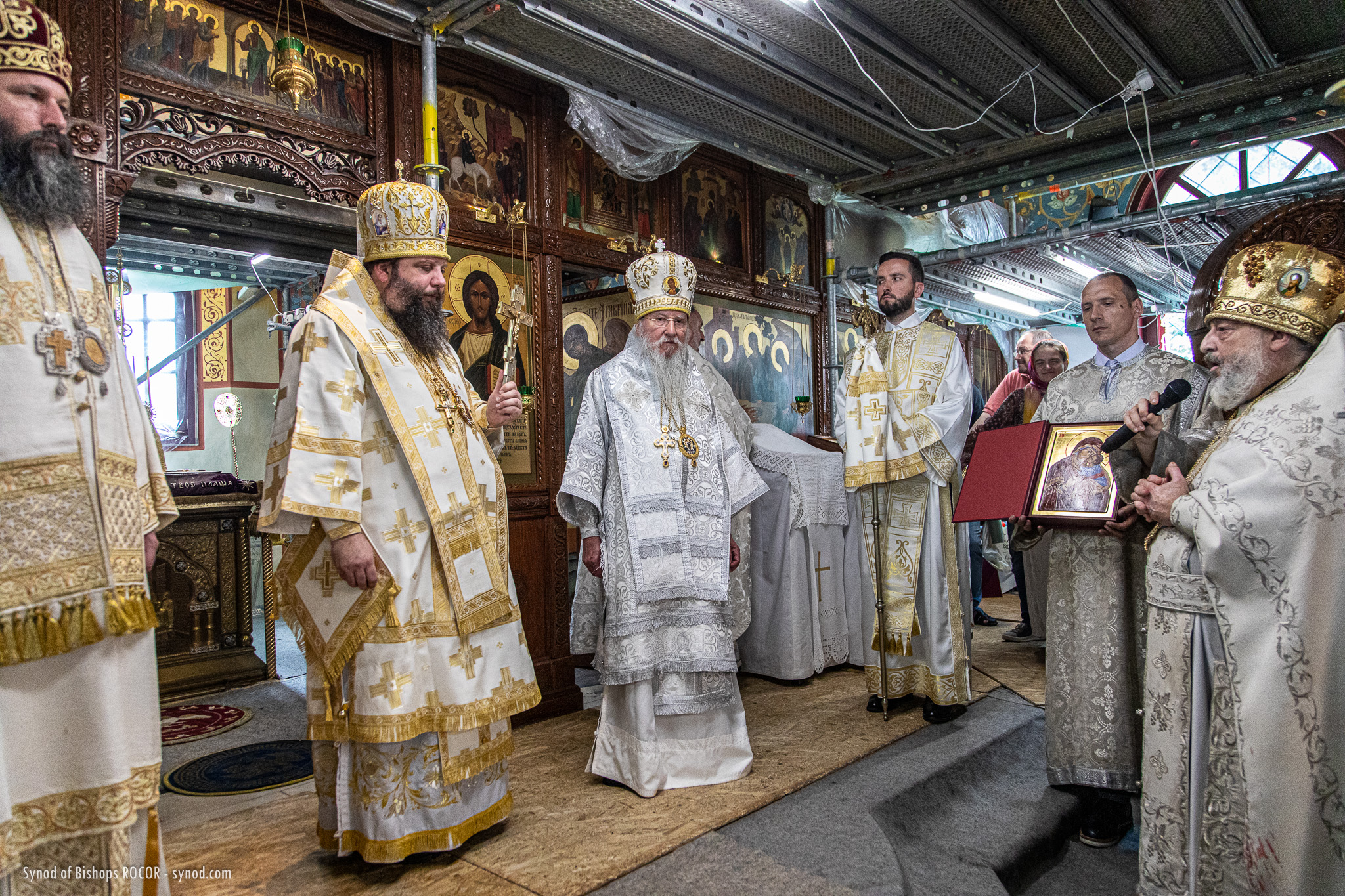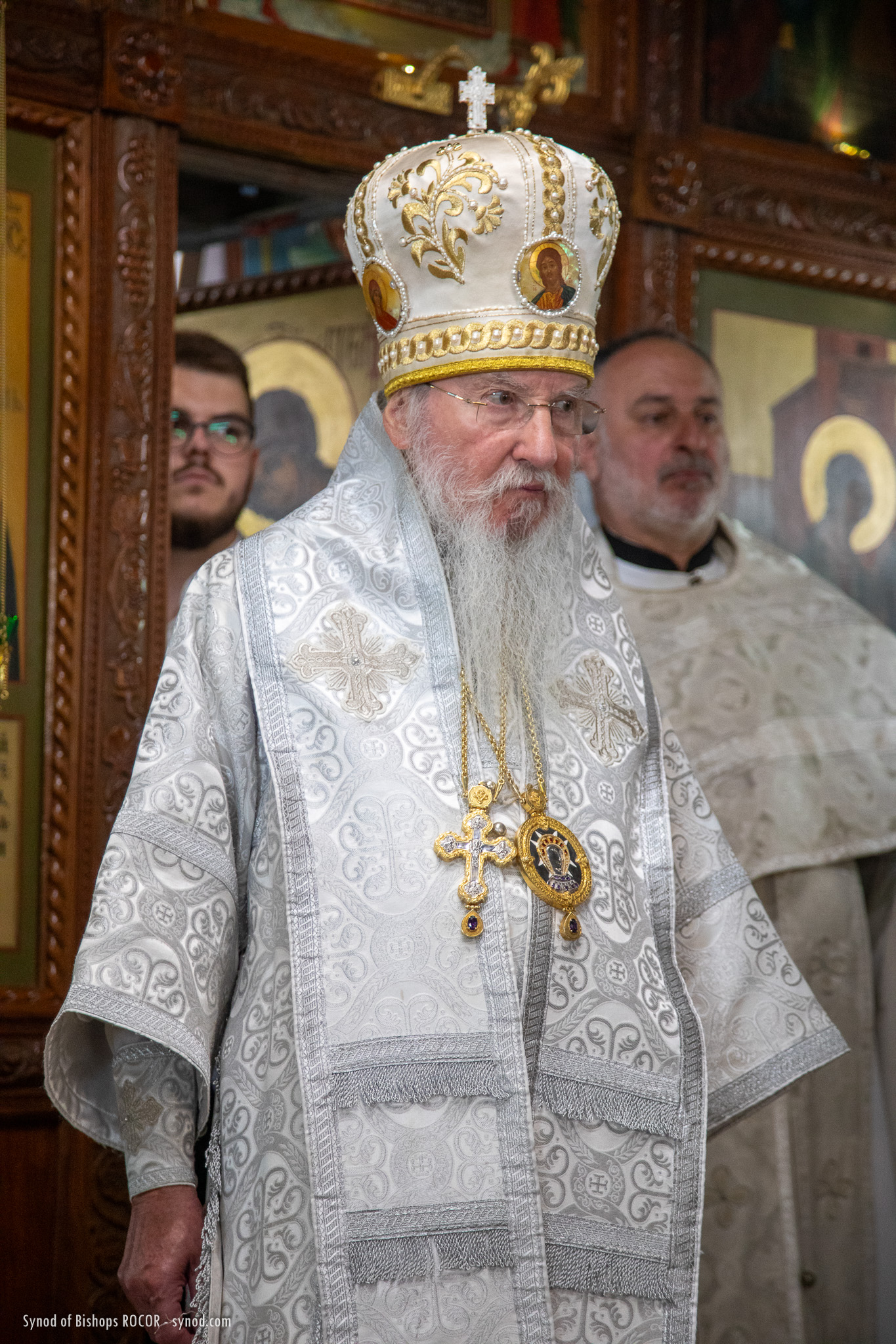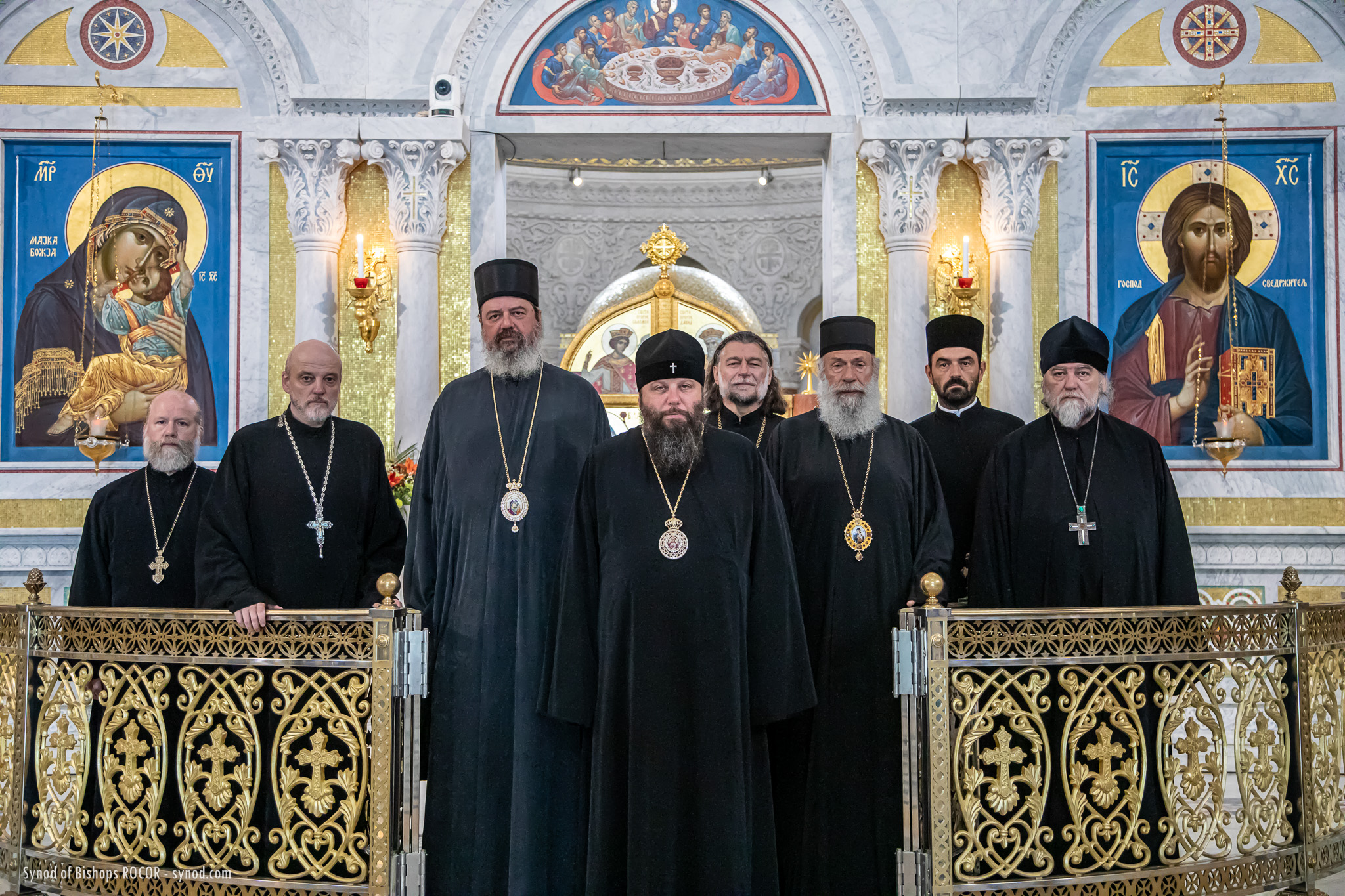 Metropolitan Nicholas is accompanied by members of the Synod of Bishops: His Eminence Metropolitan Mark of Berlin and Germany, His Eminence Archbishop Gabriel of Montreal and Canada, His Eminence Archbishop Peter of Chicago and Mid-America, His Grace Bishop Irenei of London and Western Europe, His Grace Bishop Job of Stuttgart, as well as Protopriest Serafim Gan, Chancellor of the Synod of Bishops and Secretary of the First Hierarch of ROCOR, as well as Archpriest Luka Novakovic and Archpriest Ljubo Milosevic, cleric of the Eastern American Diocese, Secretary of the Diocese of Mid-America, Archpriest Gregory Joyce, and Reader George Konev.