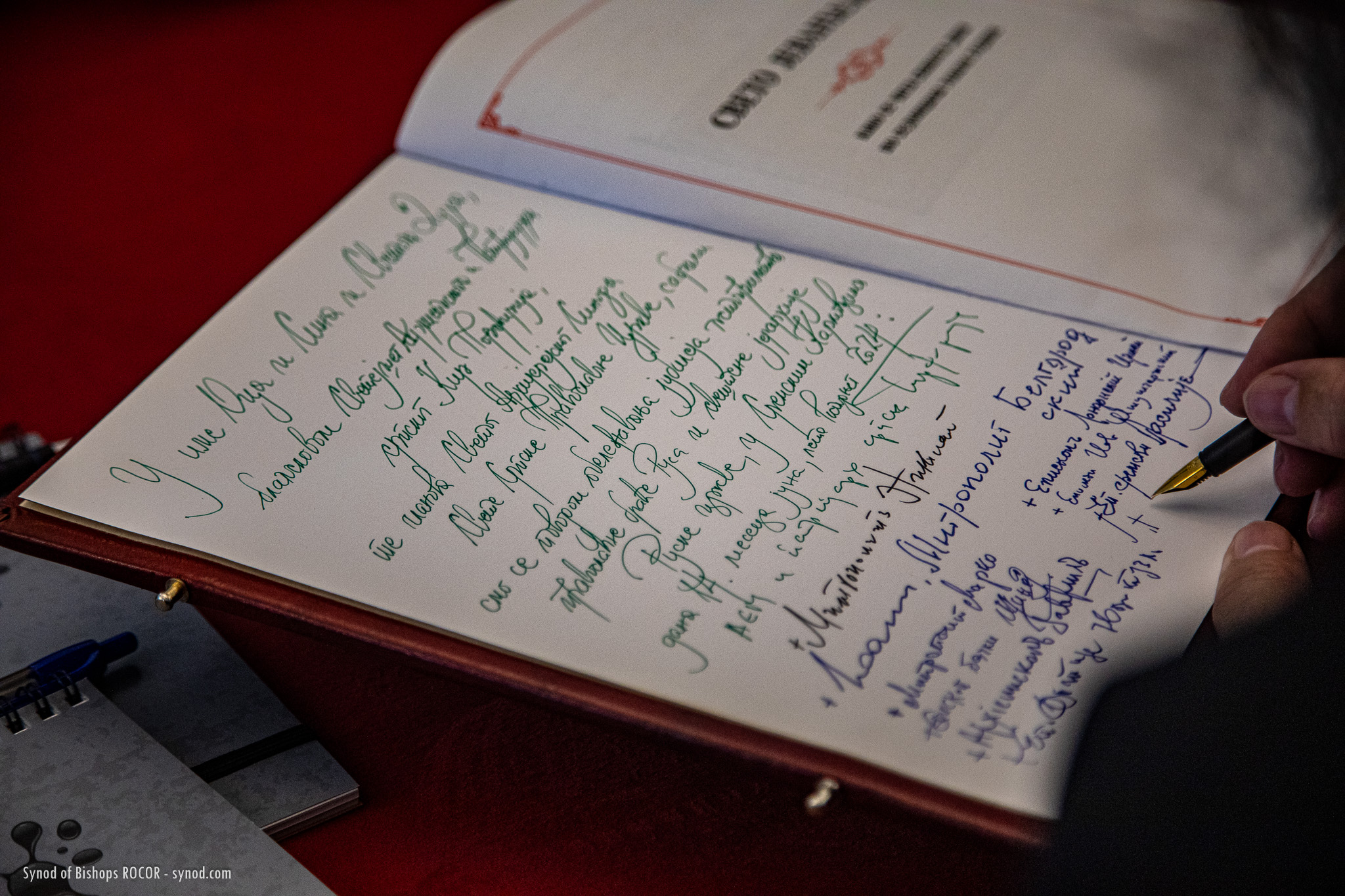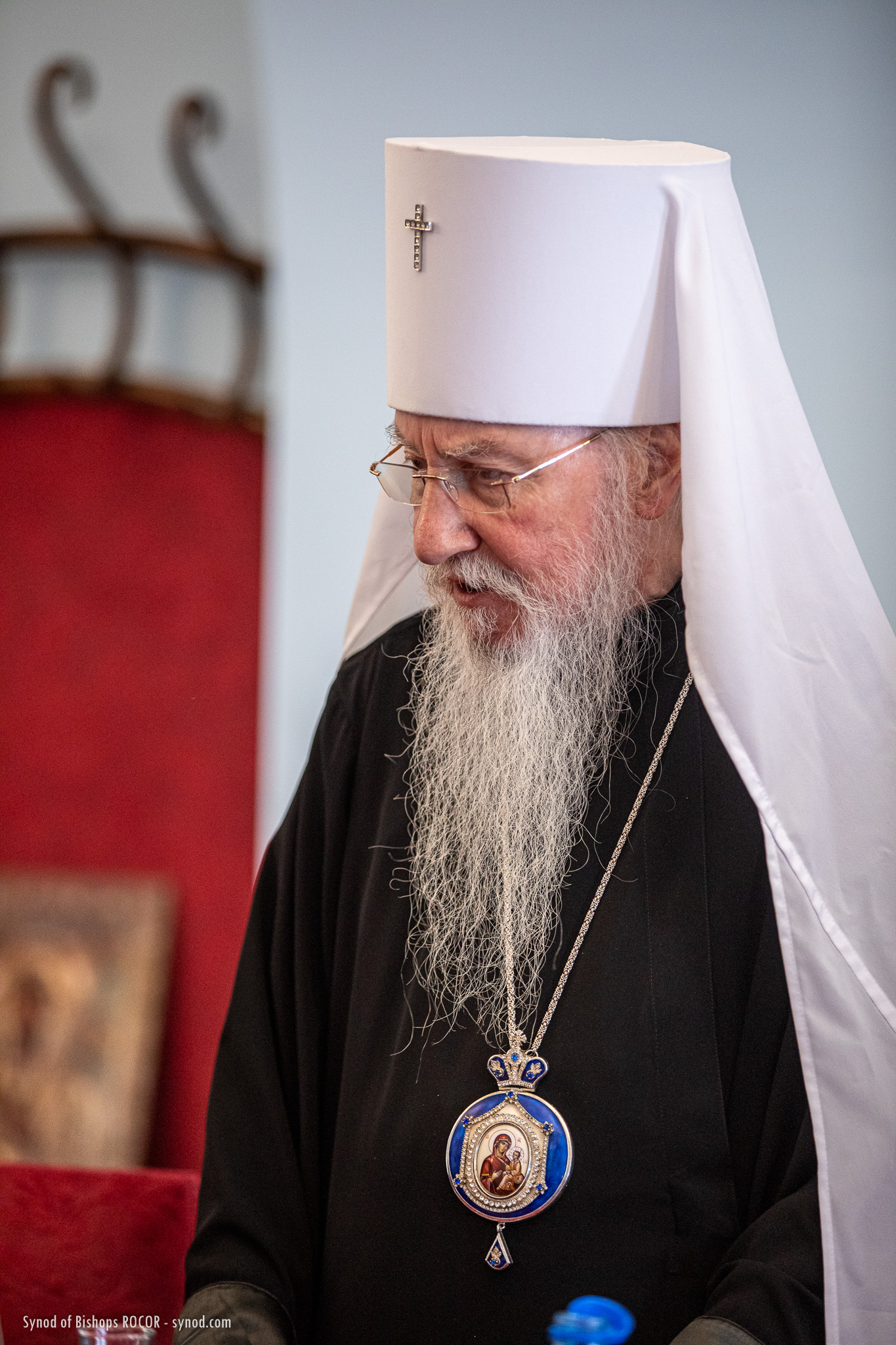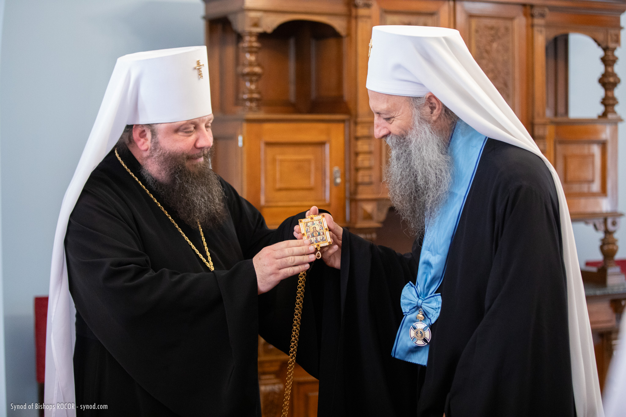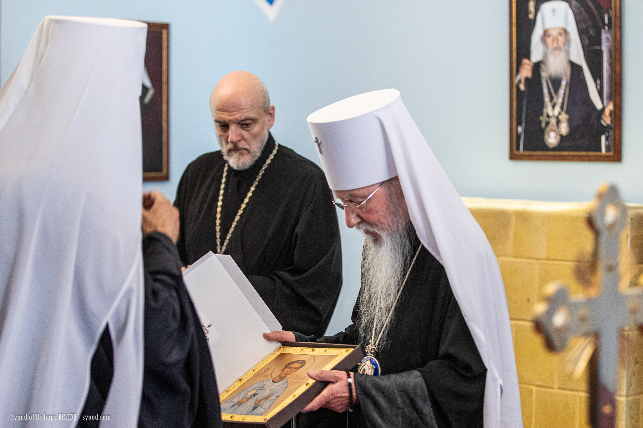 After a prayer and opening words by His Holiness, Metropolitan Nicholas delivered a welcoming speech, at the end of which he awarded His Holiness with the Synodal Order of the Kursk-Root Icon of the Mother of God “of the Sign,” 1st Degree, and gave the Primate an icon of the Mother of God depicted together with St John of Shanghai and St Jonay of Hankow, along with the Holy New Martyrs and Ascetics of the Russian diaspora painted to mark the centennial of the Russian Orthodox Church Outside of Russia, as well as a panaghia as a memento.