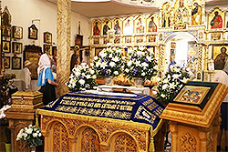 The shroud was magnificently adorned in the center of the cathedral. A multitude of parishioners prayed at the divine services for the Pascha of the Theotokos, as the feast of the Dormition of the Mother of God is often called. Virtually all communed of Christ’s Holy Mysteries.