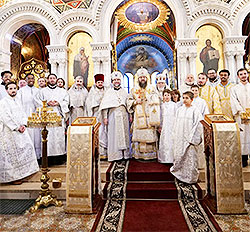 Co-serving the Bishop were the Cathedral clergy: Archpriest Pavel Tsvetkoff, Archpriest Emilian Pocinok, Priest Antoine Barros and Archdeacon Dometian (Redko). They were joined by Priest Bogdan Babenko, who serves in the newly-formed Parish of St John the Wonderworker in Pau, France, and who arrived in Geneva on the occasion of the Feast, whereupon he received an antimins and chrism for the new parish, as well as various liturgical items gifted from the Cathedral.
