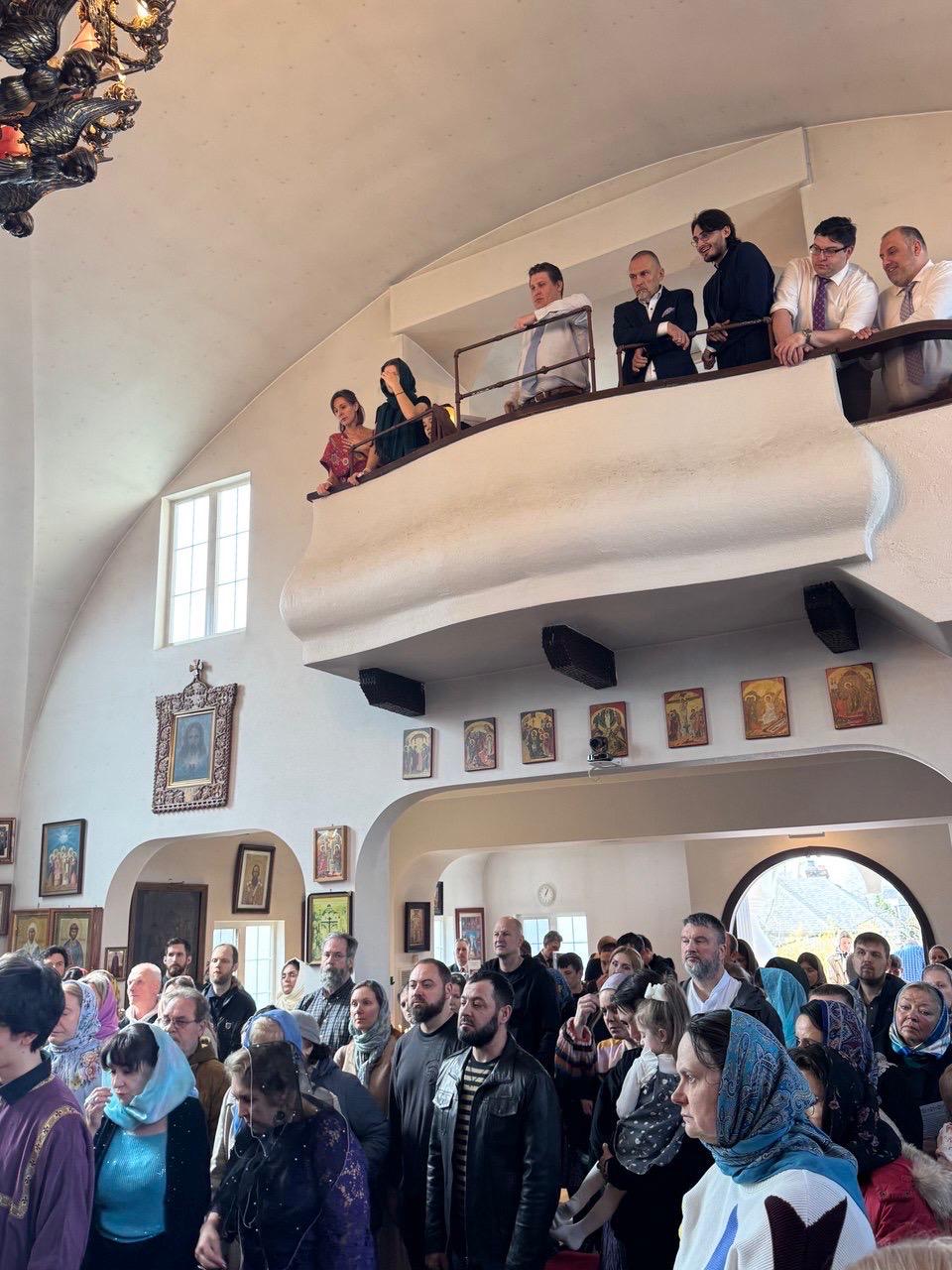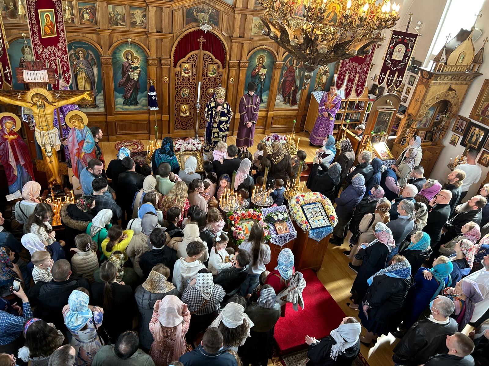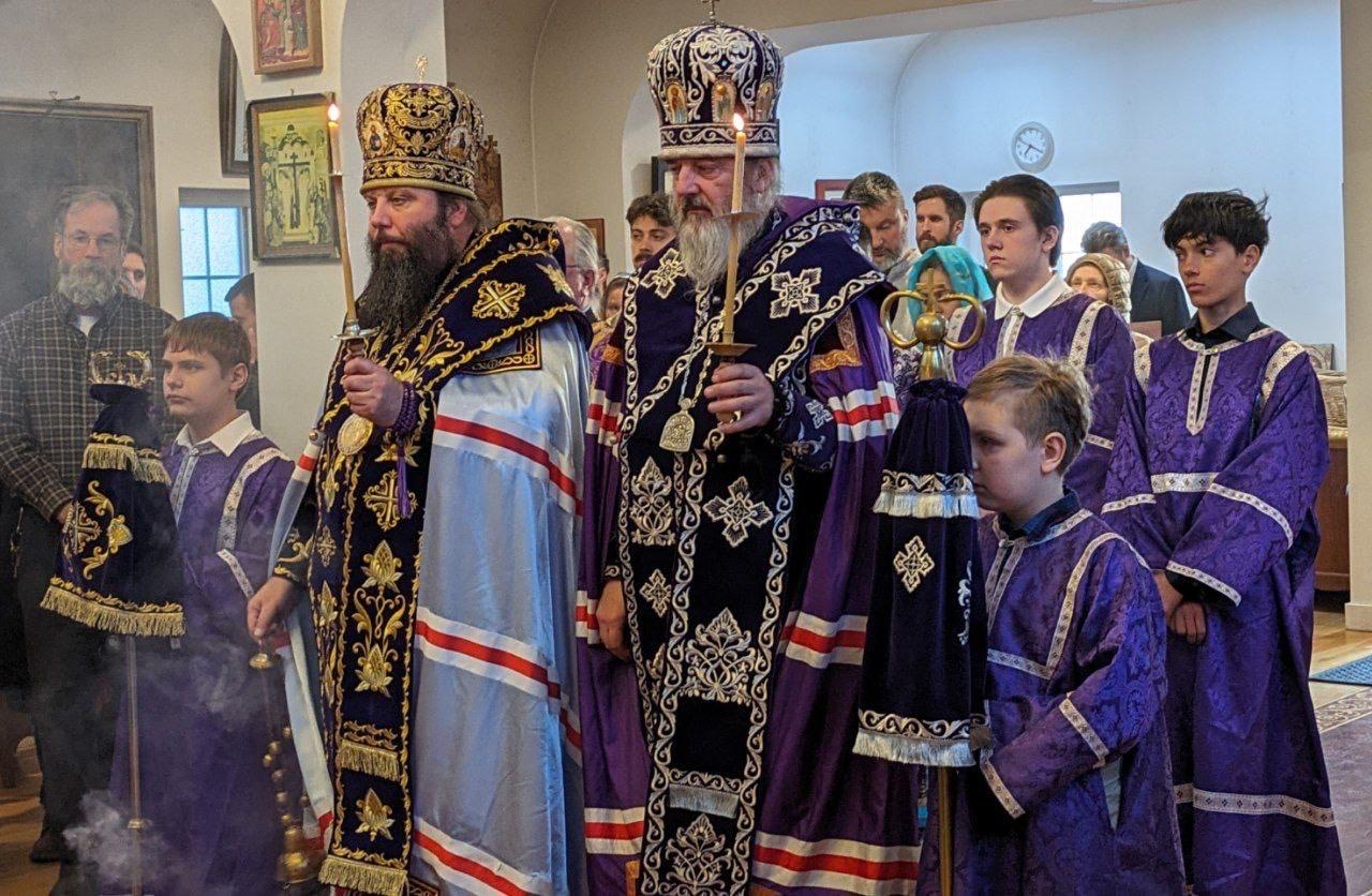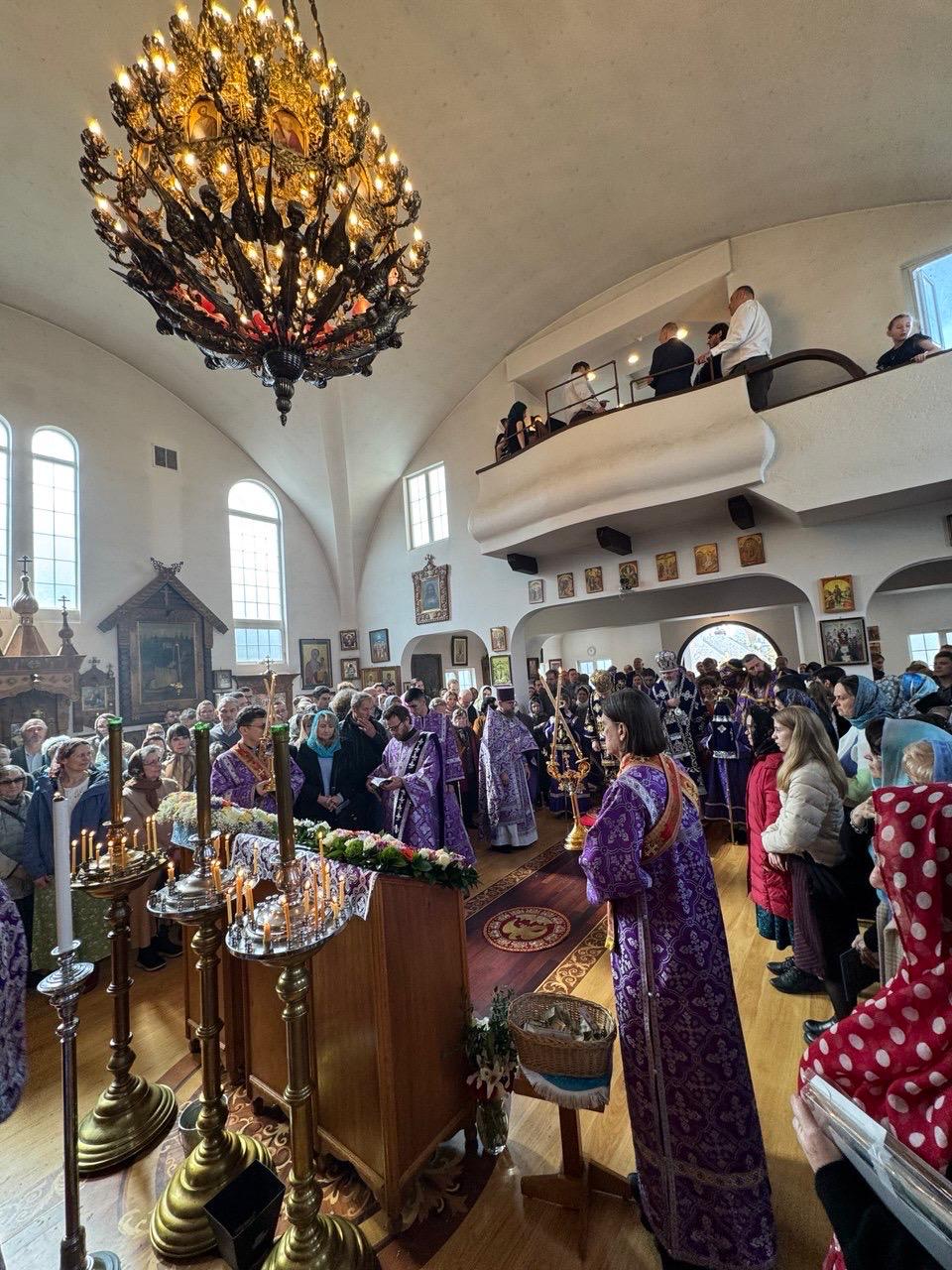 Upon dismissal, the First Hierarch congratulated His Grace, the clergy, and the faithful on the fourth Sunday of Great Lent and the namesday of their dean, expressing gratitude for their prayers. His Eminence also noted the sacrifice of the parishioners of the cathedral, who sent a significant amount of money they collected to repair the Synodal residence in New York. Congratulating Metropolitan Nicholas on the Sunday holiday and wishing him God's help in his ministry, Bishop Theodosius invited all those gathered to a large luncheon organized through the efforts of the cathedral sisterhood.