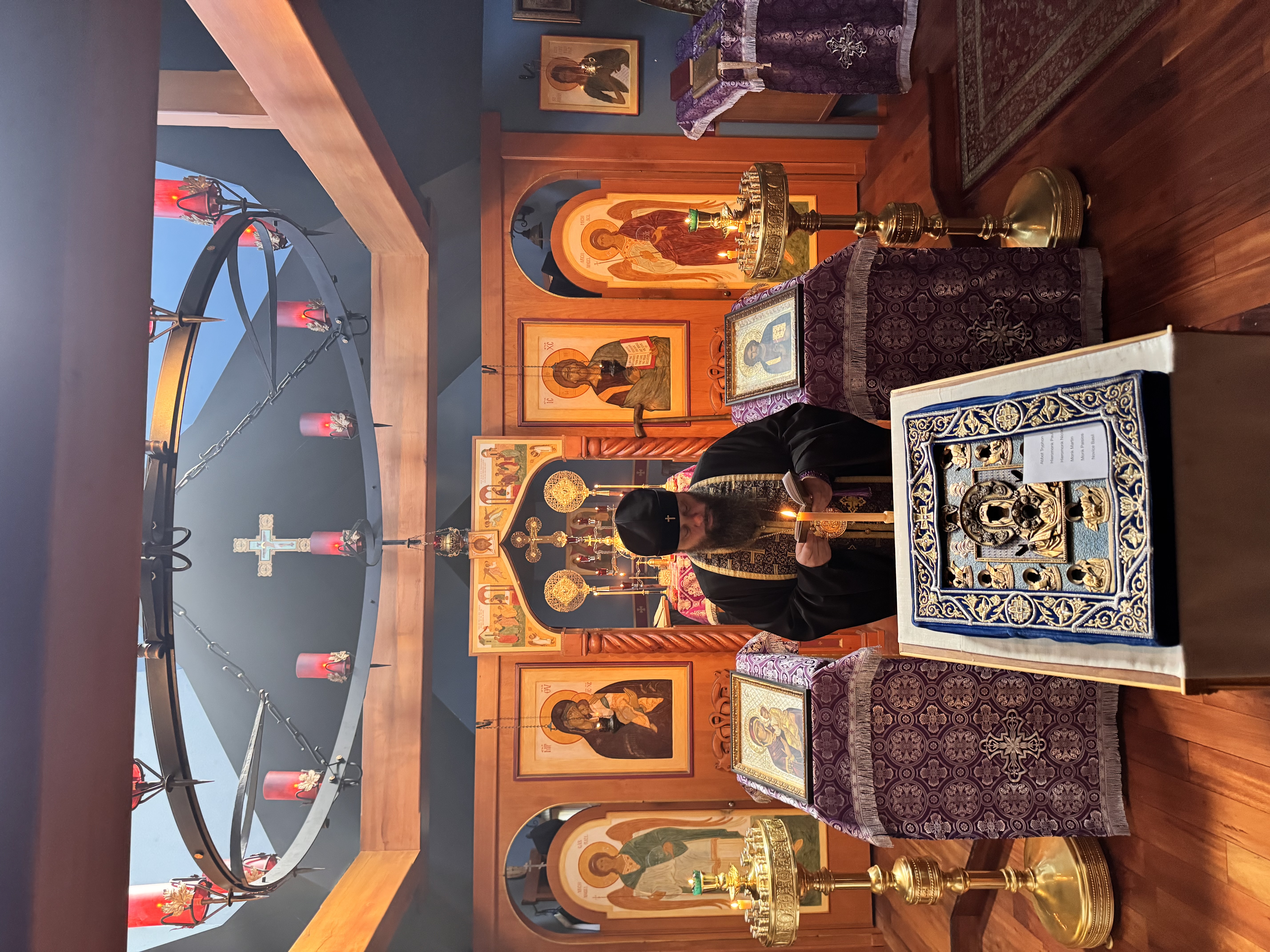 On Friday, March 28, His Eminence visited Fr Alexei at the local hospital. After praying before the main holy icon of the Russian diaspora for his health, Metropolitan Nicholas presented him with a jubilee pectoral cross issued for the 725th anniversary of the appearance of the miracle-working icon and the 100th anniversary of the Russian Orthodox Church Outside of Russia, and spoke with Fr Alexei and his family. On the evening of the same day, His Eminence officiated at the Rite of Unction at St Nicholas Cathedral, co-served by His Grace Bishop Theodosius of Seattle and the local clergy, with a large gathering of worshipers.