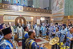 Divine Liturgy on this festive day was celebrated by the Primate of the Orthodox Church in America, His Beatitude Tikhon, Archbishop of Washington, Metropolitan of All America and Canada. His Beatitude was co-served by a host of hierarchs and clergy of the Orthodox jurisdictions in North America: the First Hierarch of the Russian Church Abroad, Metropolitan Nicholas of Eastern America & New York; Archbishop Iriney of Ottawa and Canada (OCA); Bishop Irinej of Eastern America (Serbian Orthodox Church), Interim Administrator of the Patriarchal Parishes in the USA & Canada, Bishop Matthew of Sourozh; Archpriest Igor Vyzhanov (cathedral rector); Archpriest Thomas Zain (vicar general of the Antiochian Archdiocese in North America); Priest Alessandro Margheritino (acting chancellor of the Orthodox Church in America); Archpriest Serafim Gan (chancellor of the Synod of Bishops of the Russian Church Abroad), as well as the clergy of the Patriarchal Parishes in the USA and the Russian Church Abroad.