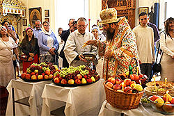 During the festive Divine Liturgy, the First Hierarch was assisted by Fr Andrei and the cathedral clergy, as well as Fr George. The Synodal choir, conducted by Isaiah Trofimenko, sang during the service. Many believers gathered to pray on this great feast. After Liturgy, Metropolitan Nicholas blessed baskets of fruit in accordance with feast-day tradition. Congratulating everyone on the holiday, Vladyka Nicholas joyfully noted that a festive service was held on the Holy Land, on Mount Tabor led by the Patriarch of Jerusalem, and for which the sisters of the monasteries of the Russian Abroad Church prayed.