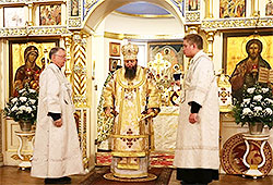 On Thursday, August 28, on the feast of the Dormition of the Most Holy Theotokos, Metropolitan Nicholas arrived at the Dormition Convent "Novo-Diveevo" to celebrate the patronal feast of the monastery with the monastics, clergy, and believers. He brought with him the relics of Saint Tikhon, All-Russian Patriarch-Confessor, for the faithful to venerate. The service began with an akathist to the Dormition of the Theotokos with the small blessing of water; then there was a meeting of the First Hierarch of the Russian Orthodox Church Outside Russia. During the Divine Liturgy at the Seraphim Cathedral, His Grace was joined by the Senior Priest Protopresbyter Alexander Fedorovsky and the monastic clergy.