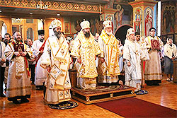 On Friday morning, before Liturgy, the clergy greeted Metropolitan Nicholas. Cathedral Dean Archpriest Serge Lukianov addressed the First Hierarch with words of welcome and a request for their joint prayers. Concelebrating with the hierarchs were cathedral and visiting clergy.