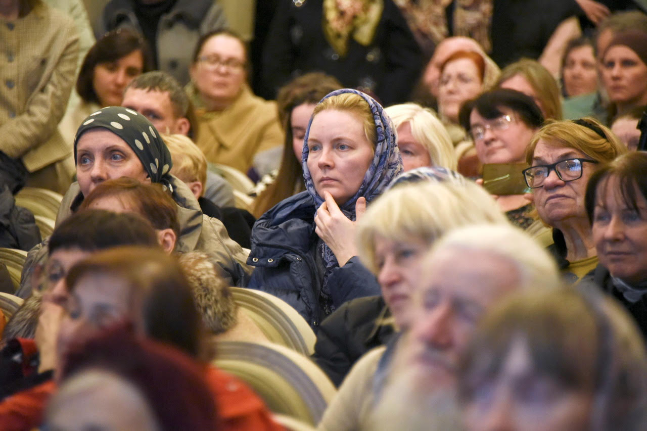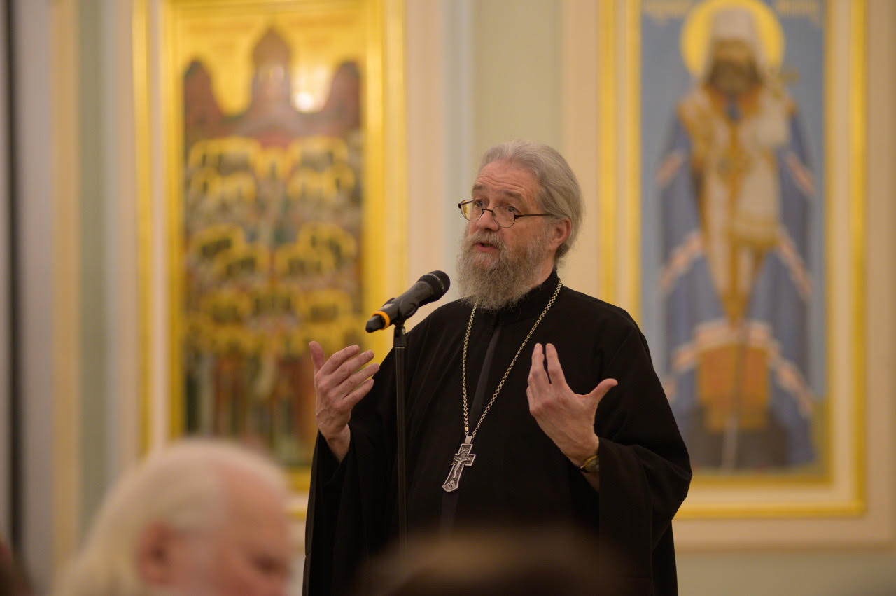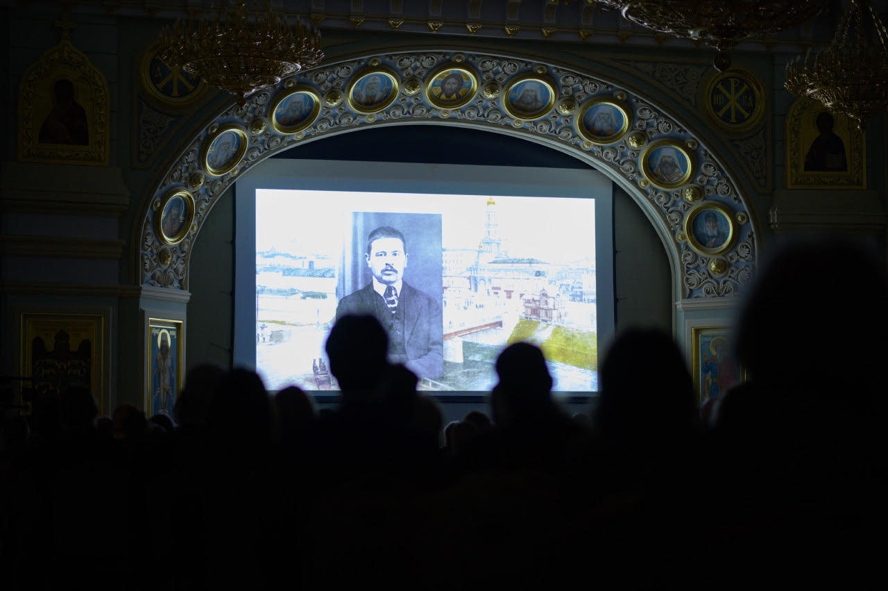 A guest of honor at the premiere was Bishop Theodosy of Manhattan. He and Archpriest Peter Perekrestov were introduced by the President of PSTGU, Archpriest Vladimir Vorobyov, who is also a member of the Synodal Theological Commission and the Commission for the Canonization of Saints. Bishop Theodosius spoke first, discussing the significance of St. John in his own life and recounting a number of miracles performed by this wondrous saint. Archpriest Peter Perekrestov shared how the movie was created and spoke of the film as an “icon in motion.” Father Peter noted a number of honored guests at the movie premiere: Bishop Panteleimon (Shatov), Dr. Ivan Vasilyevich Maksimovich – a relative of St. John, and the wife of the film’s narrator, Archpriest Sergei Pravdolubov – Father Sergei recorded St. John’s texts for the film two months before his passing – Matushka Margarita Pravdolubova. The All-Russian premiere of the film was dedicated to the Ever-memorable Metropolitan Laurus (March 16 is the day of his repose) and Archpriest Sergei Pravdolubov. The gathering sang “Eternal Memory” for them.