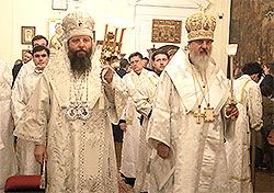 At the conclusion of Midnight Office, to the singing of "Do not lament Me, O Mother," the Holy Shroud was carried into the altar. The clergy and faithful, holding lit candles and singing "Thy Resurrection, O Christ Savior," processed with the icon of the Resurrection of Christ into the inner courtyard of the Synodal building. Metropolitan Nicholas greeted everyone with the eternally living words: "Christ is Risen!" Inside the cathedral, the hierarchs also exchanged Paschal greetings with the worshipers, as did the clergy, who changed their vestments into various colors.