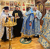 Prior to the start of the service, parish rector Archpriest Paul Ivanov arrived with the wonderworking Kursk Root Icon of the Mother of God and with it blessed the church an all of the worshippers. Vigil was served in the presence of the icon. Then followed the greeting of Metropolitan Mark. The diaconal service was performed by visiting Deacon Nicholas Ilyin (cleric of Holy Dormition Convent "Novo-Diveevo" in Nanuet, NY) and parish Deacon Fiodor Tulbur. Also taking part in the service was parish cleric Archpriest Vasyl Yurina.