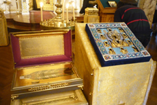 According to custom, the symposium opened with a moleben in the Cathedral of Our Lady �of the Sign� before the Kursk-Root Icon of the Mother of God. A reliquary with the relics of St Innocent was brought especially for this event from the Holy Synod of the Orthodox Church in America. His Grace Bishop Jerome of Manhattan, Vicar of the Eastern American Diocese of ROCOR, blessed the participants with little icons of St Innocent blessed over his relics.�