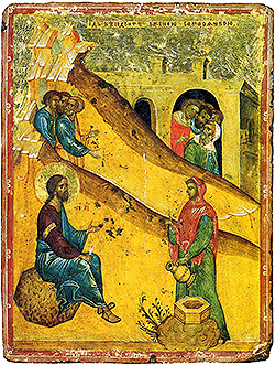 The Lord commands the women then to summon her husband. She replies that she has no husband. But the Lord rebukes here and shows that He knows everything about her life. The Samaritan woman, seeing that a Prophet speaks to her, knowing that which is secret, then asks Him the question that troubled all Samaritans: “Our ancestors worshiped on this mountain, but you Jews claim that the place where we must worship is in Jerusalem.” The Lord responds that salvation is from the Jews (that is, that the Savior comes from the Jews), but a time will come and has already arrived when one can worship God everywhere, and that true worshipers will worship the Father in spirit and truth, for they are the kind of worshipers the Father seeks.