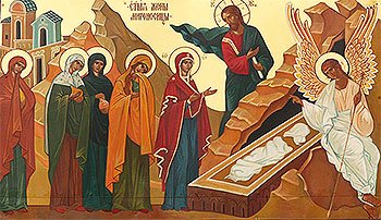 The very sight of the lifeless Most-Pure Body of Christ temporarily slaked the thirst for vengeance in the Jewish men, but the Holy Myrrh-Bearing Women, after a sleepless night, arose early to hasten to the Tomb to pour forth their love for their Teacher and Guide in the form of the aromatic funerary fragrant oils.