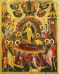 For three days before her blessed end, amid burning prayer on the Mount of Olives, Archangel Gabriel announced to her that she would make the final passage, and gave her a frond from heaven. The Heavenly Queen, the Mother of God, was not confounded, she did not fear for her moment of death, and joyously took to her deathbed. In response to her wish, the Holy Apostles were miraculously gathered at her deathbed to pay their last respects at her funeral. On August 15, at three o�clock in the afternoon, when the Most Holy Virgin Mary lay on her deathbed awaiting her end, and suddenly the light of Divine glory shone forth, and all the candles burning in her home were extinguished. The Apostles and others in attendance were astounded by what they saw.