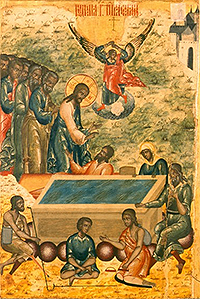 Symbolizing through the healing of the paralytic the beginning of the Gospel harvest, and bringing a true gift to the Father on the holy day of Pentecost, Christ made the former paralytic a communicant in the great feast. Instead of lying on the bed of sickness, the healed man was able to go to the House of God with offerings and praises (John 5:14); and, having found the Son in the Father’s house (cf. Luke 2:49), he realized that his healing had been spiritual even more than it was physical. “See, you are well!”-says Christ, “Sin no more” (John 5:14), in other words, live righteously. “I cleansed you from stain, I healed you from sin, I made you whiter than snow, and led you into the House of God - live the life for which you have been created: live righteously, keep your baptismal garment clean and undefiled.”