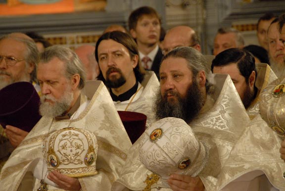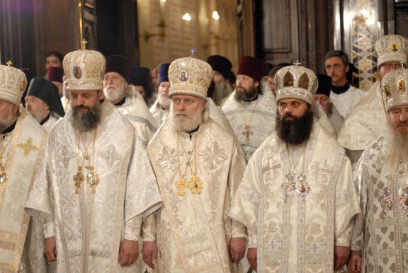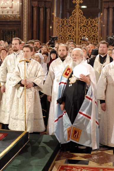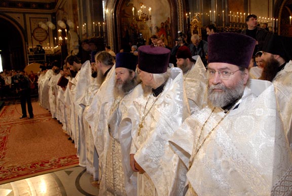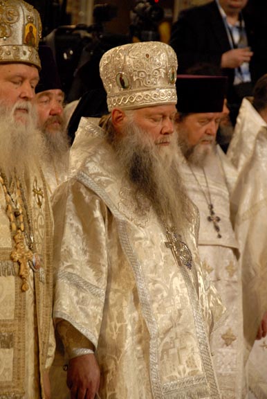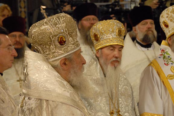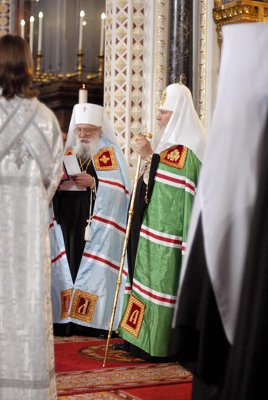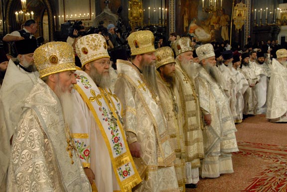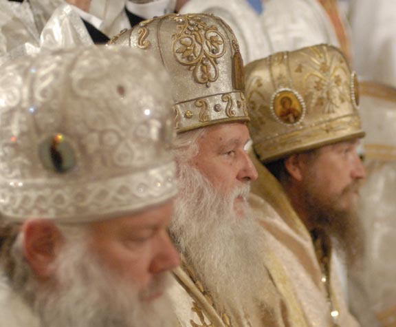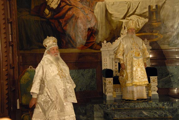Greeting His Holiness Patriarch Alexy II of Moscow and All Russia were the archpastors of the Russian Orthodox Church Outside of Russia and members of the Holy Synod of the Moscow Patriarchate, plus Archbishop Innokenty of Korsun and Archbishop Evgeny of Verey, members of the Moscow Patriarchate's Commission, who all emerged together through the Royal Doors wearing white vestments.
