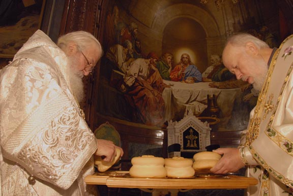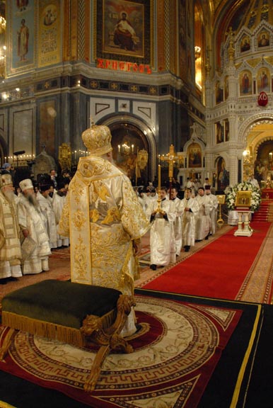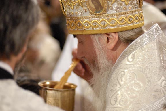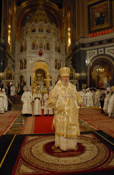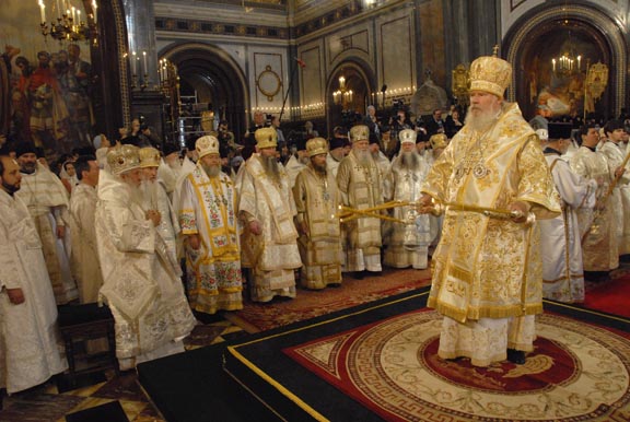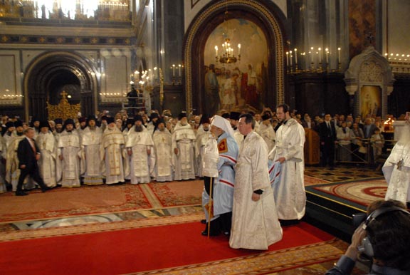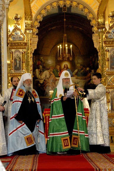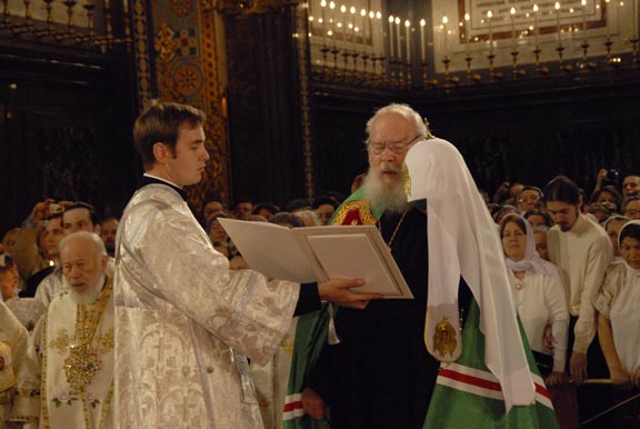 After the troparions, sung in turn by the unified choir of the Russian Orthodox Church Outside of Russia and by Holy Trinity-St Sergius Lavra Choir, His Holiness Patriarch Alexy II of Moscow and All Russia read a special prayer which included the words: “As Thee lifted Thy prayers to Thy Heavenly Father for Thy disciples, that they all be as one, gaze now with Thy merciful eyes upon Thy people, who have sinned and disobeyed Thy will, bless now our good intention and the unification of the Church to Your Glory, create this Thyself, dampen all church temptations and divisions. Having given to us Thy law to love Thee, our God, and our neighbor, deliver us from all insult and disruption, may brotherly love reign among the children of our Church, in the Fatherland and in the diaspora. Grant that we may now enter Thy temple and bring Thy bloodless sacrifice, that we may be unified in one body through communion with Thy Life-creating Body and Thy Honorable Blood and bring praise with all our hearts to Thy ineffable love for mankind.”
