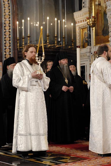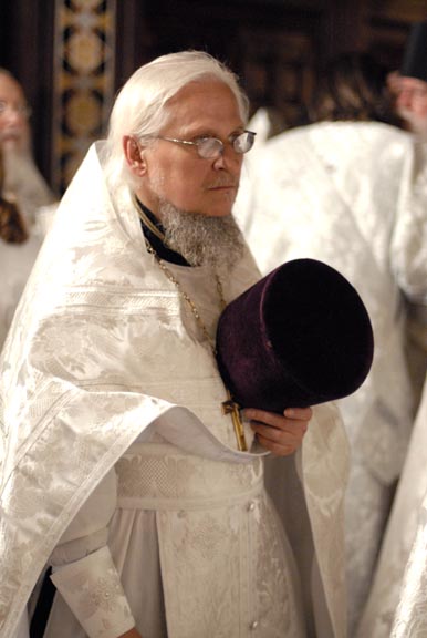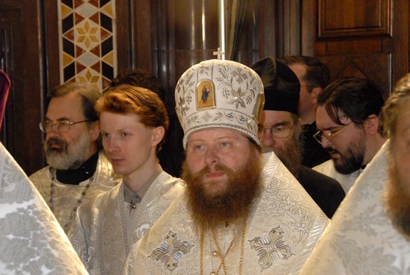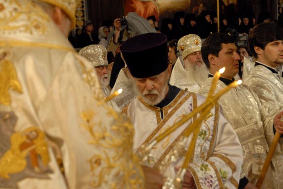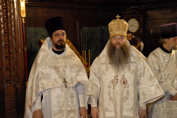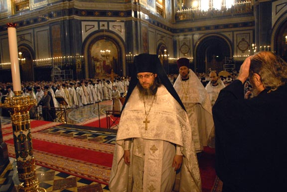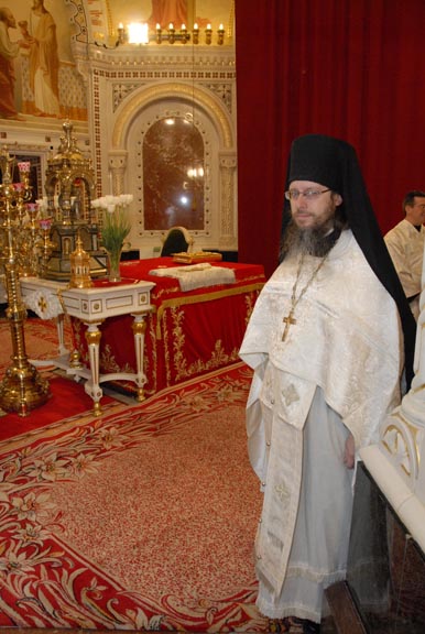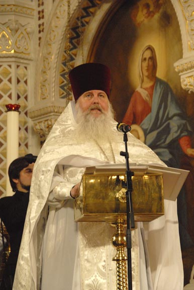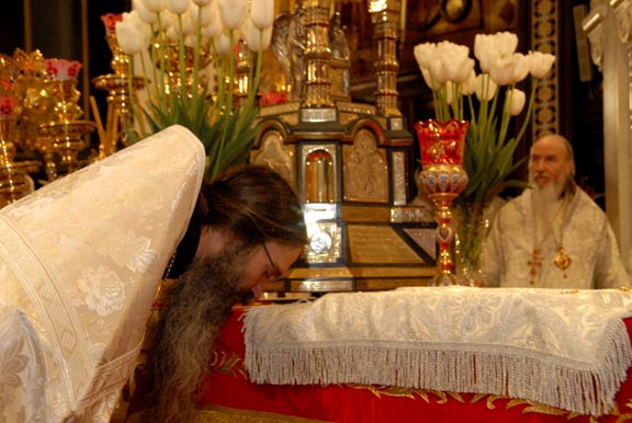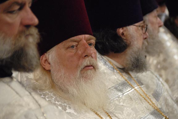 During the proskomedia, the First Hierarch of the Church Abroad arrived. His Eminence was greeted by the Secretary of the Commission of the Russian Orthodox Church Outside of Russia on talks with the Moscow Patriarchate, Protopriest Alexander Lebedeff, and the Secretary of the Commission of the Moscow Patriarchate on talks with the Church Abroad, Protopriest Nikolai Balashov. Clergymen of the Moscow Patriarchate emerged from one of the side altar doors to greet His Eminence, and an equal number of clergymen of the Russian Orthodox Church Outside of Russia from the other side. Venerating the altar-table cross, His Eminence Metropolitan Laurus blessed the clerics and worshipers with it, and then entered the altar.