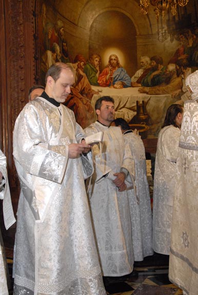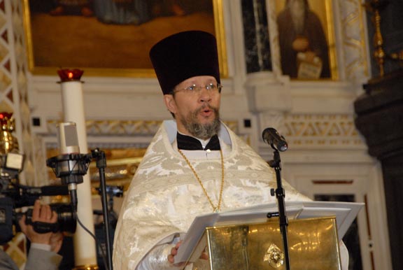 Then, the Secretaries of both Church Commissions, Mitred Protopriest Alexander Lebedeff and Protopriest Nikolai Balashov read the texts of the decrees of the Holy Synod of the Moscow Patriarchate and of the Synod of Bishops of the Russian Orthodox Church Outside of Russia on the confirmation of the Act of Canonical Communion. The text of the Act itself was read from the ambo by Protodeacon Vladimir Nazarkin.