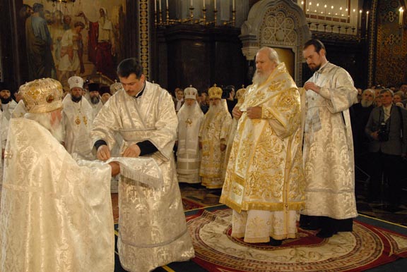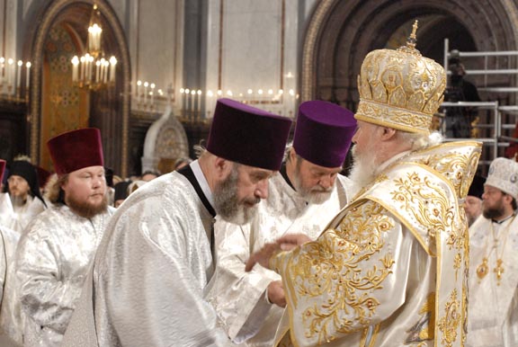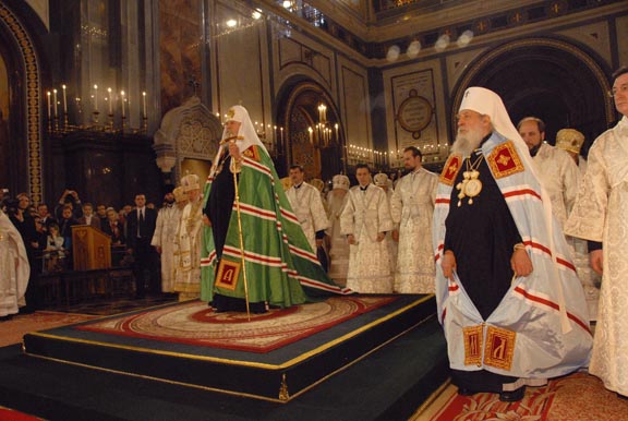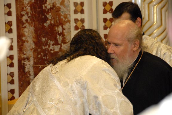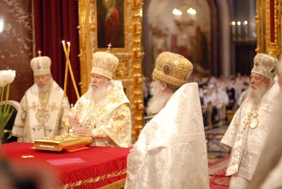 The Act was then signed on the ambo of Christ the Savior Cathedral. His Holiness Patriarch Alexy II of Moscow and All Russia and His Eminence Metropolitan Laurus of Eastern America and New York put their signatures under this historic document. Then, with the words “Christ is among us! Now and forever,” they kissed each other three times.