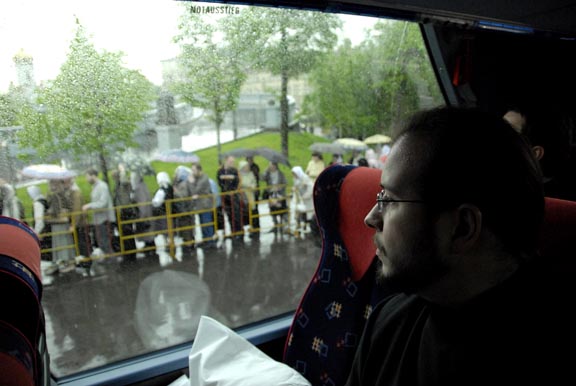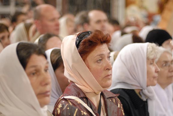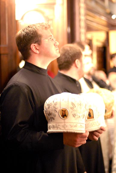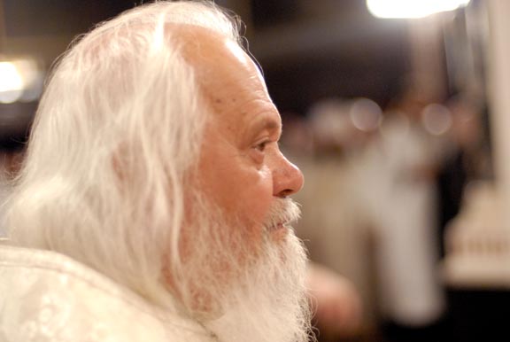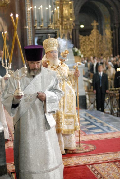 Donning the mantle, His Holiness blessed the bishops and clergymen with the cross, after which he ascended the cathedra in the middle of the church. As His Holiness Patriarch Alexy II entered the church, His Eminence Metropolitan Laurus of Eastern America and New York proceeded to the cathedra. Standing on the north and south sides were the bishops and clergymen of the Russian Orthodox Church Outside of Russia and the Moscow Patriarchate.