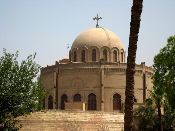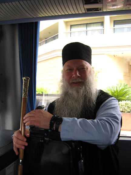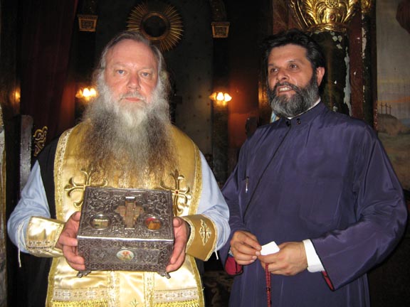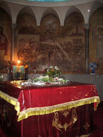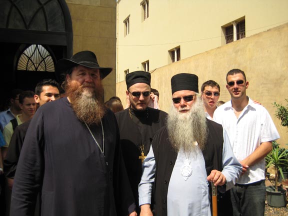 At the Monastery of Holy Great Martyr, Victory-bearer and Wonderworker George (Alexandrian Patriarchate), His Grace performed a moleben before the tomb of the saint, which the pilgrims then venerated. Archimandrite Nifon, the Monastery's Abbot, welcomed Vladyka Peter and the pilgrims. In the 30's AD, the Romans built a great fortress here. This is where, in 303, St George was imprisoned and endured martyrdom for Christ. The fortress was later destroyed, and later in the 4 th century, a monastery dedicated to St George was built here. The main church of the monastery is a grand edifice, the main portion of which is the rebuilt fortress itself. There are four stories in the fortress-church, two of which have over the years sunk into the earth. The uppermost church holds one of the main relics of the monastery, the miracle-working Icon of St George from the 4 th century, which is revered by even Muslims. It may be that this is because when the church burned in 1904, only this icon remained unharmed. Everything else in the church was destroyed: the iconostasis, the liturgical items and vestments.