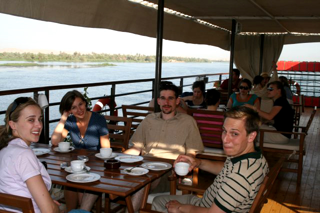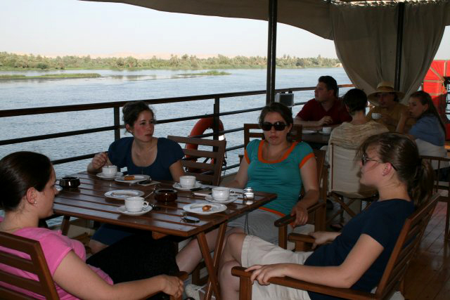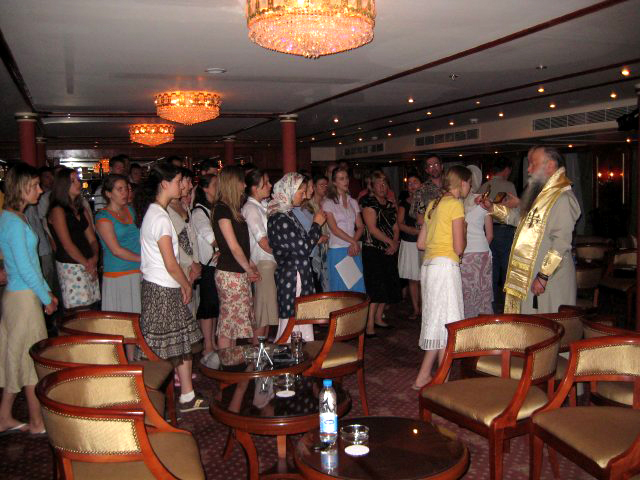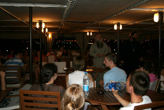 On Thursday, June 28, the young participants of the pilgrimage “In the Footsteps of Moses” traveled on the Nile River to northern Egypt, from where they soon headed for Mount Sinai. On the cruise ship, His Grace Bishop Peter of Cleveland held discussions with the pilgrims on Holy Scripture, the history of the Church and St John (Maximovich) of Shanghai and San Francisco, for whom His Grace served as cell-attendant in the 1960's. Choir rehearsals were also held on the vessel under the direction of Michael Gill, Director of the Cathedral Choir of Holy Virgin Protection Cathedral in Chicago. God willing, the youth choir will sing during divine services they attend on their pilgrimage. On the eve of the feast day of St John, Bishop Peter performed a moleben before the saint's icon.