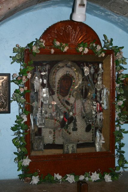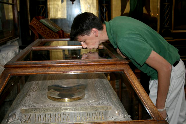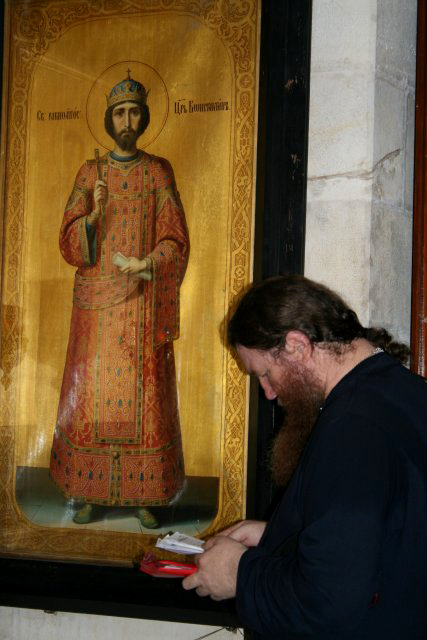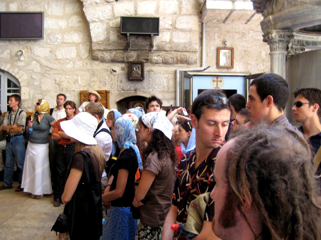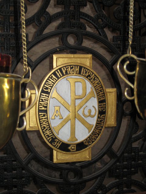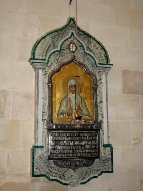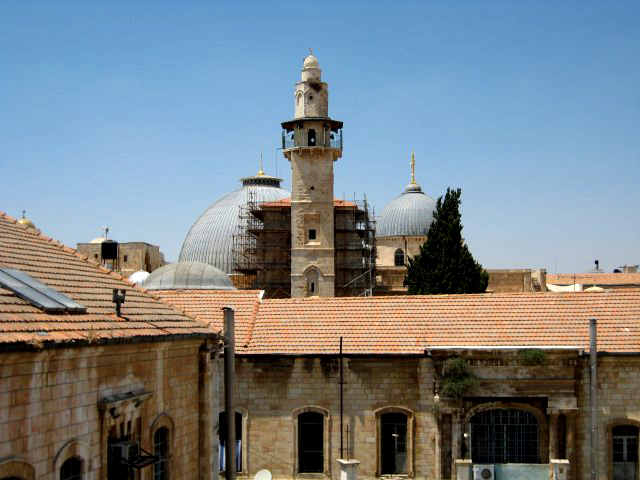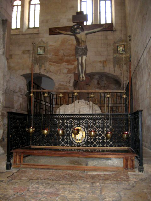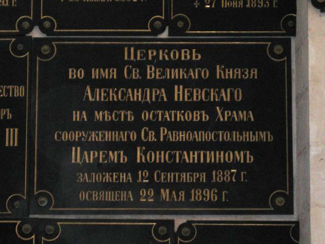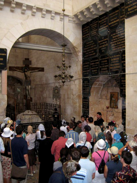 This discovery was acknowledged by experts throughout the world. The Russian Consulate decided to build on another site, and a church was built over this final leg of the Way of the Cross, elevated upon a wide court rising over the Gates, apparently a part of Constantine the Great's church. A stone altar table was found there, apparently part of a chapel in that church, which had once covered a whole series of holy sites. This altar table was left in place, and an altar and iconostasis were built to the east, the church then dedicated to St Alexander Nevsky. The Holy Threshold is found in this edifice, which also contained some rooms to accommodate pilgrims. The threshold is covered by a wood and glass display case. Beyond it is a large Crucifix on a shard of original stone. An ancient wall stretches out on the left, abutting a wall upon which is a large icon of the Savior carrying the Cross. These massive remains extend past the Russian parcel and continue as part of the adjacent Abyssinian monastery.